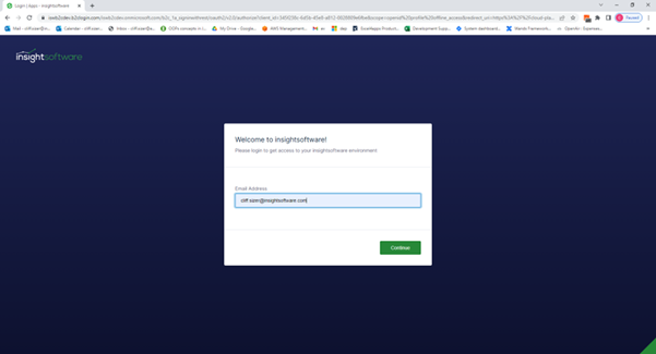 To log in to the Platform portal use your web browser navigate to https://app.insightsoftware.com/ and enter your user email address to continue.