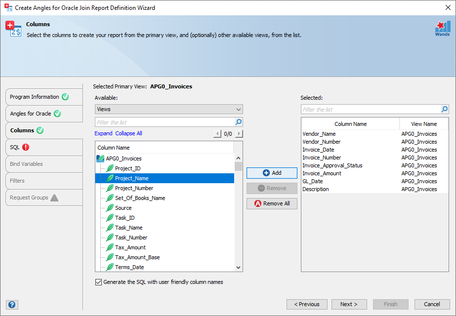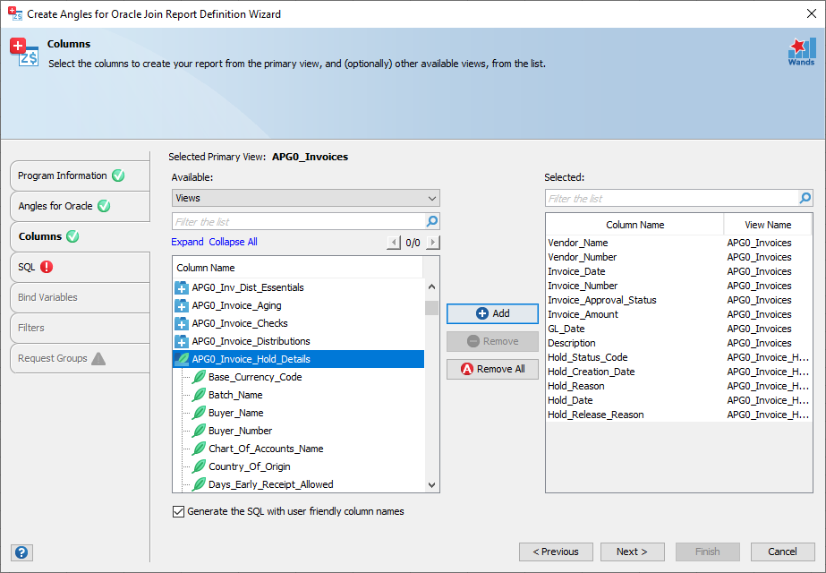 Column ambiguously defined – It is possible that a user friendly generated column name could conflict with another column from a different Angles for Oracle view. If you select “Invoice Number” from two different views. This causes a SQL exception, “ORA-00918: column ambiguously defined”. Simply modify one of the column aliases in the SQL stage or remove the unnecessary column from the Columns stage to continue.