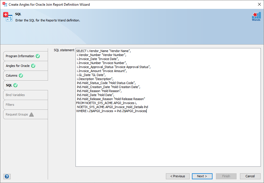 Continue with the Bind Variables, Filters and Request Group stages as per the Create Report Definition Wizard.