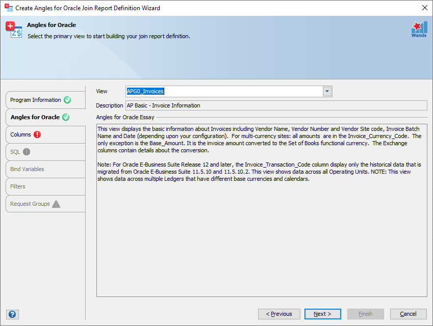Select the columns required for your report definition from the primary Angles for Oracle view. The primary Angles for Oracle view will always be at the first item of the available views panel on the left. If no fields from the primary Angles for Oracle view are selected you will be unable to continue and an error message will be displayed. Columns from the primary Angles for Oracle view should form the basis and overwhelming majority of columns selected to build this report definition.