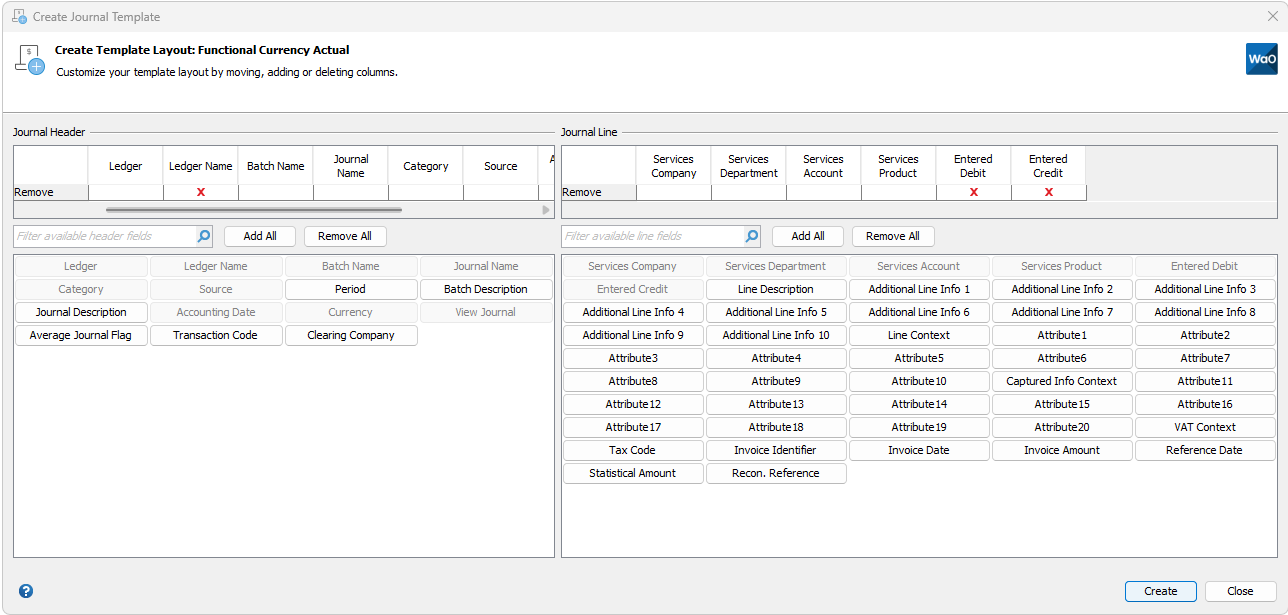 Available fields may not be dragged from the Journal Header to the Journal Line section and vice versa.