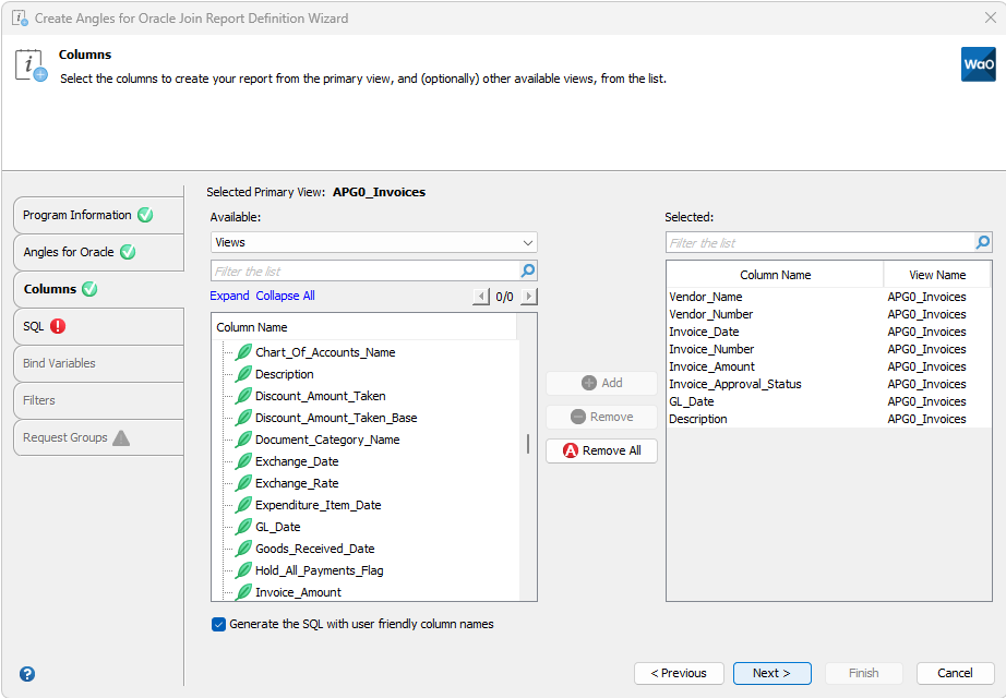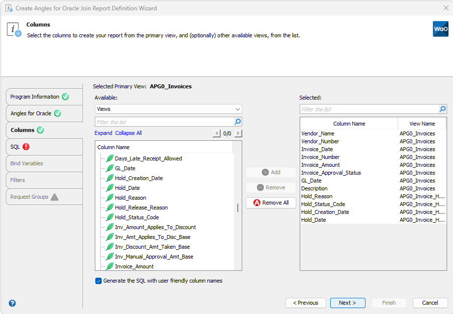 Column ambiguously defined – It is possible that a user friendly generated column name could conflict with another column from a different Angles for Oracle view. If you select “Invoice Number” from two different views. This causes a SQL exception, “ORA-00918: column ambiguously defined”. Simply modify one of the column aliases in the SQL stage or remove the unnecessary column from the Columns stage to continue.