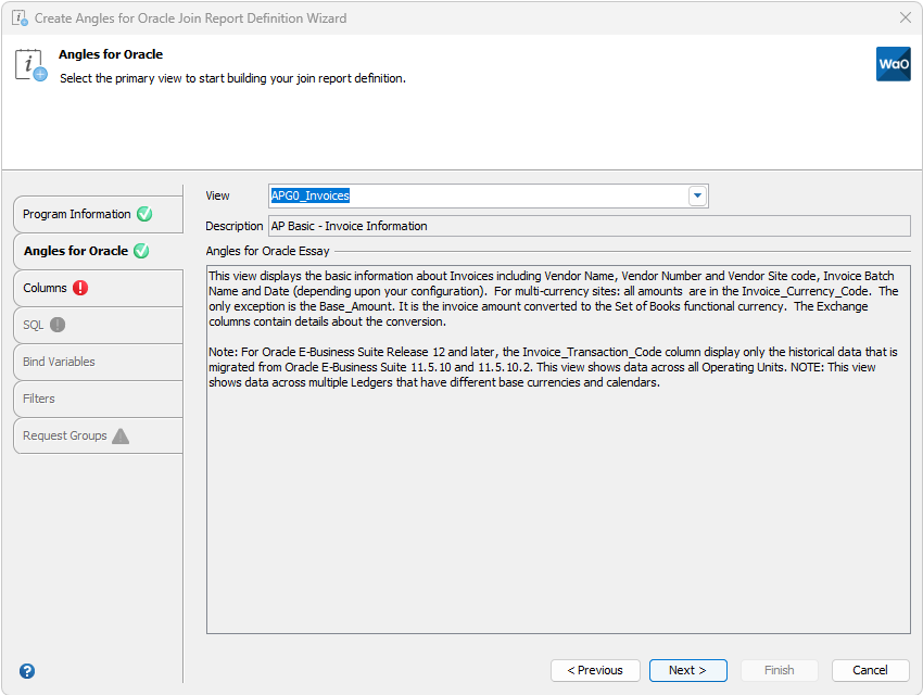 Select the columns required for your report definition from the primary Angles for Oracle view. The primary Angles for Oracle view will always be at the first item of the available views panel on the left. If no fields from the primary Angles for Oracle view are selected you will be unable to continue and an error message will be displayed. Columns from the primary Angles for Oracle view should form the basis and overwhelming majority of columns selected to build this report definition.