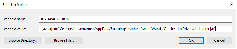 -javaagent:”C:/Users/<username>/AppData/Roaming/insightsoftware/Wands/Oracle/JdbcDrivers/JarLoader.jar”