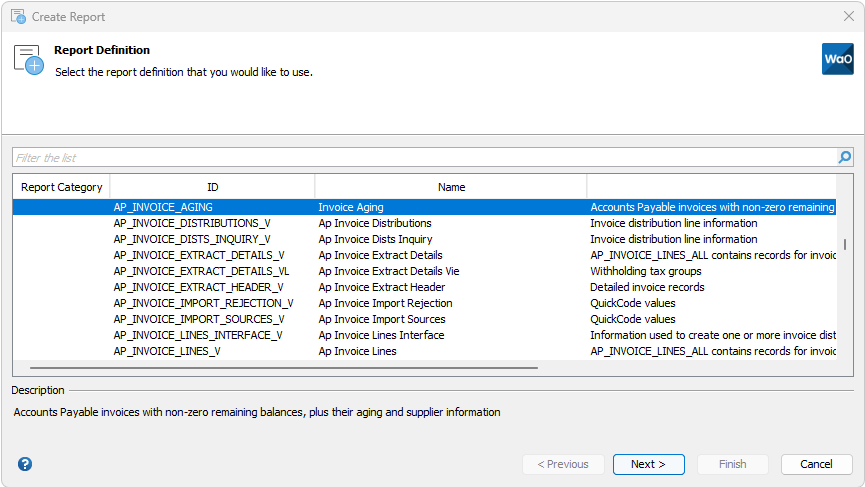This will bring up a list of reports available to the currently selected responsibility. The description for the report can be lengthy and will only be displayed once a report is selected.